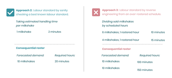 The other problem is that this approach will not take into consideration any productivity unless that is added as an additional percentage. To clarify, if the labor standard of making a milkshake is 2,5 minutes it would mean that if you expect to sell 10, you will need 25 minutes. However if you reverse engineer you might see that during one hour you sold 6 and another hour you sold 4. This would indicate that labor standard is 10 or 15 minutes, which is not true in both cases. This is because the unproductive time is already part of the calculation here, which you get no clear view on when you reverse engineer. In the original example we have 35 minutes of unproductive time, but that fact can be used in the rostering process to decide whether an hour of staff is required or not. The third approach is often taken because an organization indicates they are not capable of providing a labor standard, but it’s not the best way to actually define it.