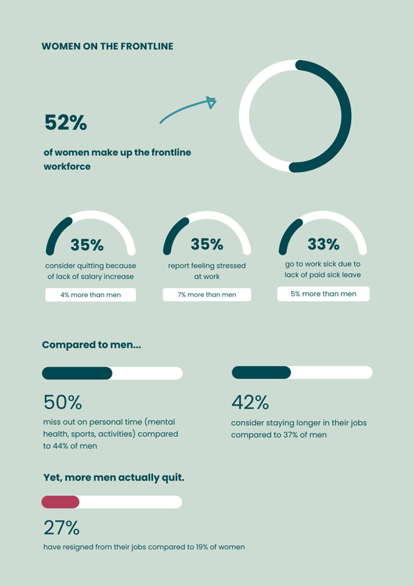 Women working frontline jobs face multiple challenges such as stagnant salaries, high levels of stress, and less access to paid sick leave. Despite these challenges, they still consider staying in their jobs longer than men.