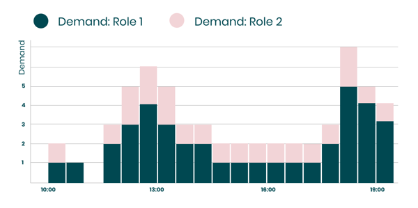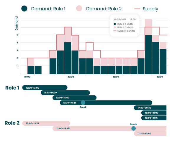 Graph 3: Translation of demand into shifts. Here you can see compliance to shift rules that require shifts to be at least 3 hours long and enforcement of breaks while minimizing under coverage of demand and amount of shifts. The more rules are added, the more it makes sense to let automation technology propose shifts.