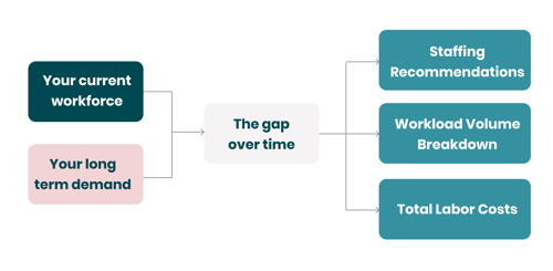 Graph 1: In order to determine long-term staffing needs and to provide a good faith estimate, you need to identify the gap between your current workforce composition and future demand. Taking Workforce Capacity Planning algorithms, you can get insights into actionable points to consider.