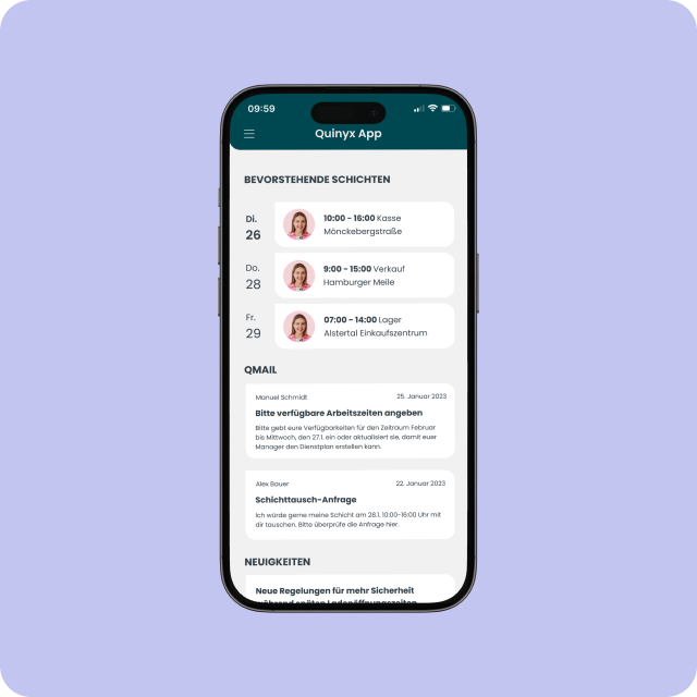 Ermöglichen Sie mit der enthaltenen Quinyx App mobilen Zugriff für alle Mitarbeitenden, Angabe von Verfügbarkeiten, unkomplizierten Schichttausch und direkte Kommunikation.