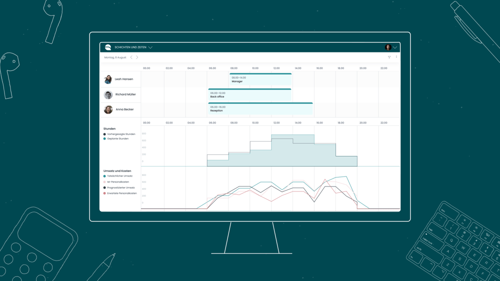 Daher beinhaltet eine gute Dienstplan-Erstellung die richtige Zuordnung der vereinbarten Arbeitszeiten zu jedem Mitarbeitenden, für jede Schicht und für jede Woche - oder längere Zeitblöcke, je nachdem, wie weit Sie im Voraus planen. Es ist unerlässlich zu wissen, wie viele Stunden Sie benötigen, und wie viel diese Stunden das Unternehmen kosten. Der Dienstplan geht dabei natürlich Hand in Hand mit der Zeiterfassung der tatsächlich geleisteten Stunden.
