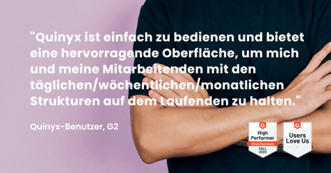 Dieses G2-Ranking basiert auf einem hohen Maß an Kundenzufriedenheit und Bewertungen von tatsächlichen Nutzer:innen von Workforce Management Software - die meisten von ihnen sind anerkannte Führungskräfte aus Unternehmen, die sogenannte Deskless Workers oder auch Frontline Mitarbeitende beschäftigen und die WFM-Software von Quinyx zur Verwaltung, Einbindung und Optimierung ihrer Belegschaft verwenden.