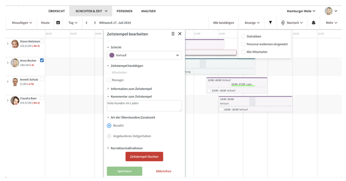 Die Detailansicht des Zeitstempels von Diana Holzmann zeigt, dass sie angegeben hat, dass viele Kunden im Laden anwesend waren, und sich deswegen die Schicht verlängert hat. Erscheint der Grund plausibel, kann der Zeitstempel trotz der Abweichung nun bestätigt oder ggf. durch die Filialleitung korrigiert werden. Die Anpassungen werden direkt in den laufenden Zeitkonten der Mitarbeiter verbucht.