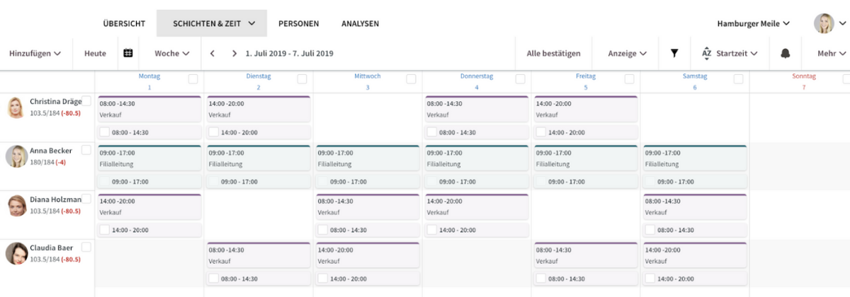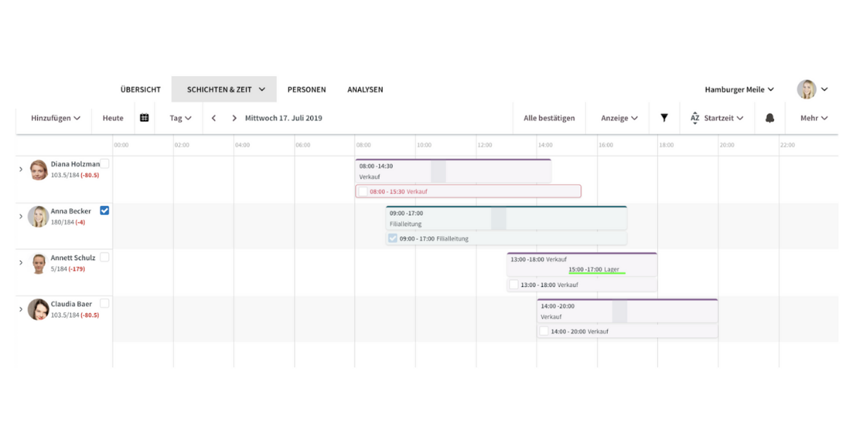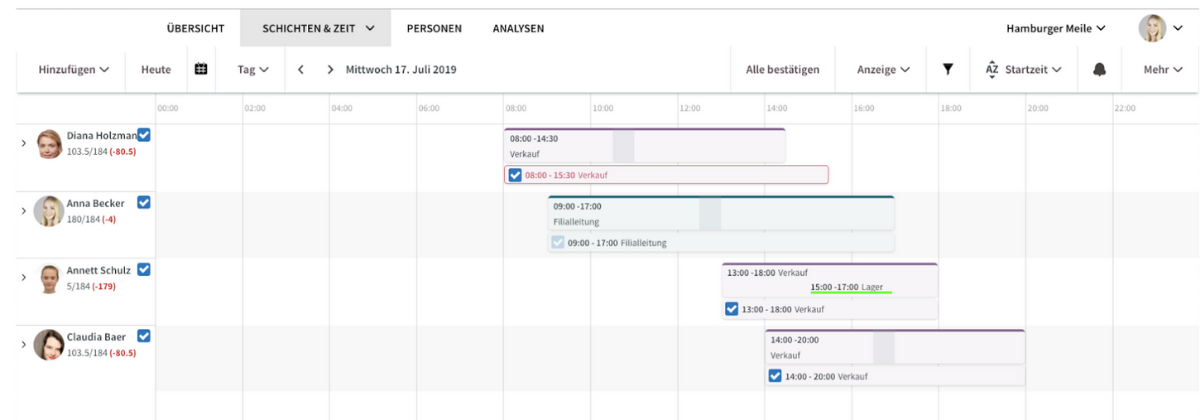 Für die Mitarbeiterin Diana Holzmann (erste Zeile) wurde eine Schicht von 8:00 Uhr bis 14:30 Uhr geplant. Die tatsächlich erfasste Arbeitszeit ist aber mit 8:00 Uhr bis 15:30 Uhr angegeben. Der Zeitstempel unterhalb der Schicht ist daher rot umrandet. Die Filialleitung sollte diesen Zeitstempel deshalb prüfen und ggf. anpassen, bevor er mit einem Haken (wie dies z.B. bei Anna Becker zu sehen ist) bestätigt wird.