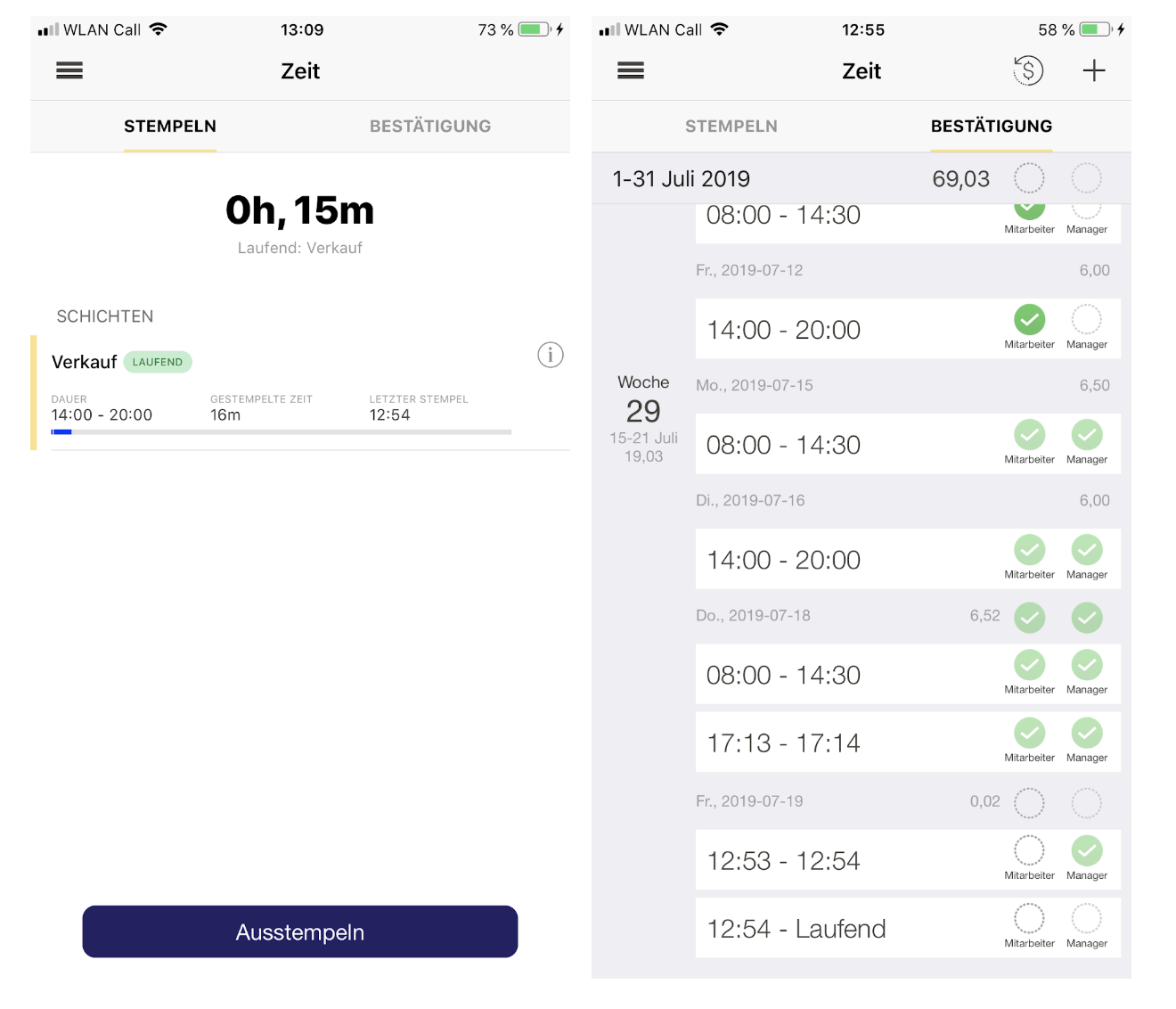 Die Zeiterfassung erfolgt also durch die Mitarbeiter per App und/oder Webpunch. Die Zeitbestätigung kann durch die Mitarbeiter direkt in der App durchgeführt werden.