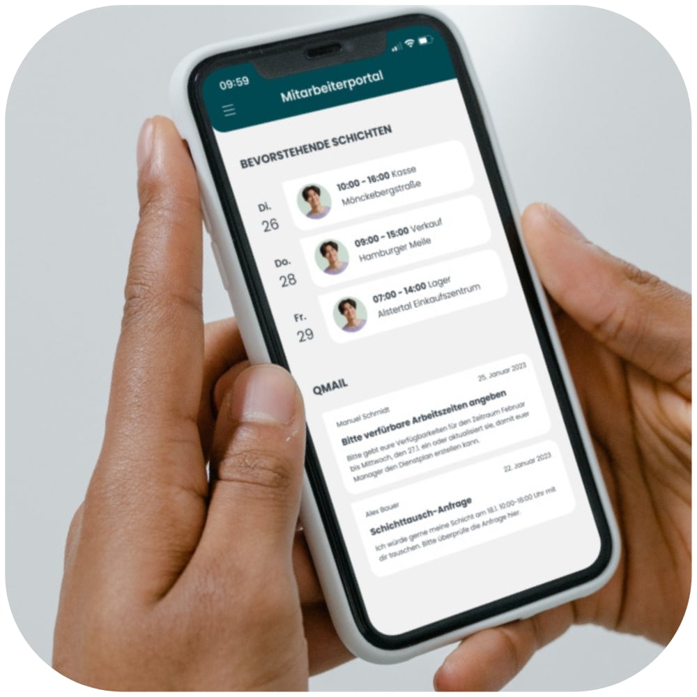Quinyx bietet durch das Frontline Portal Mitarbeiterkommunikation in einer App, die von privaten Nachrichten getrennt ist. Mit Q-Mail kommunizieren Sie außerdem schnell und sicher mit Ihren Managern und untereinander, ohne lange Telefonketten und Missverständnisse. So trennen Sie private von geschäftlicher Kommunikation und das eigentliche Ziel des Mitarbeiterengagements wird erreicht.