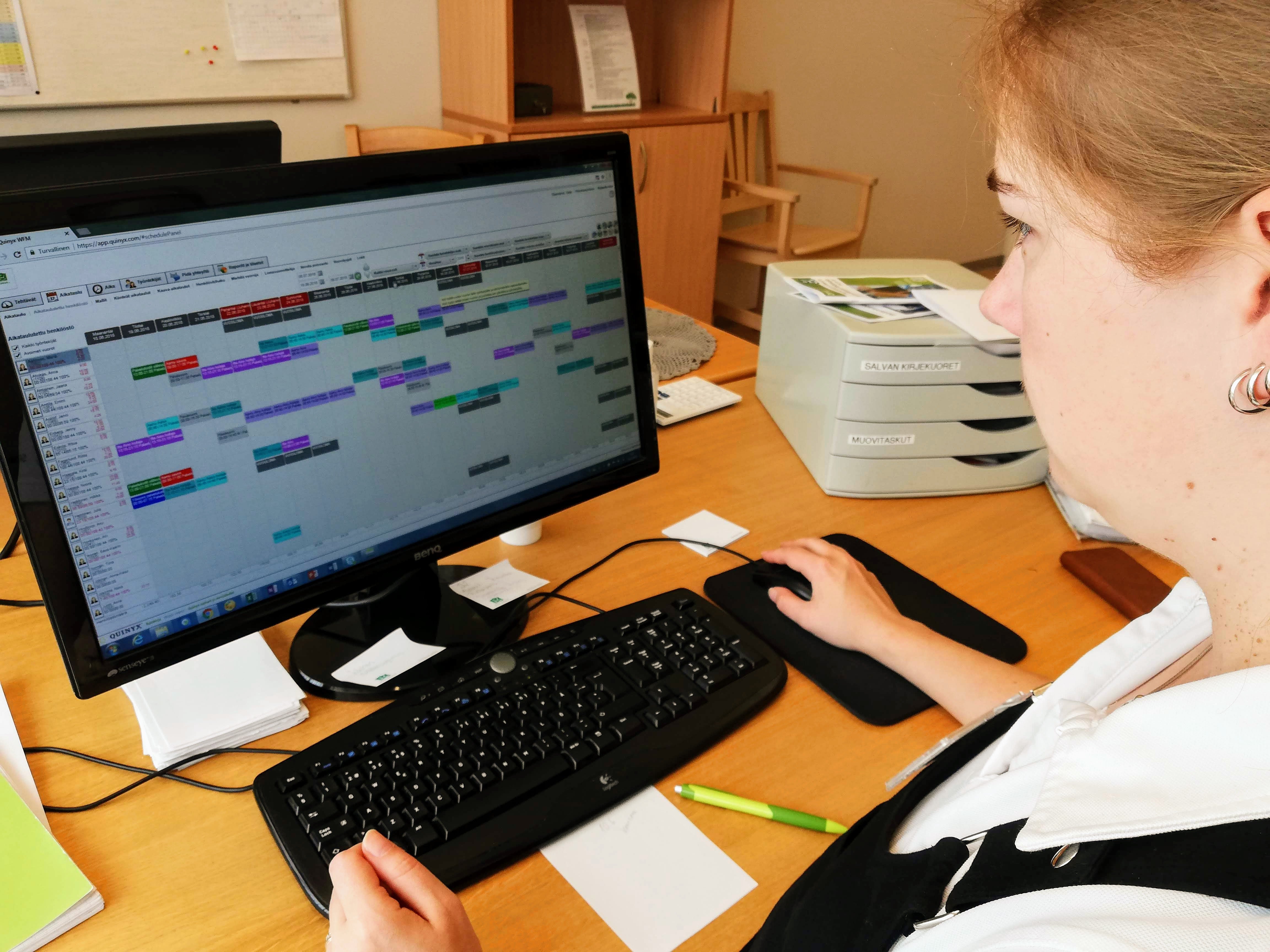Kuvassa Saija Kirjavainen työvuorosuunnittelun ääressä