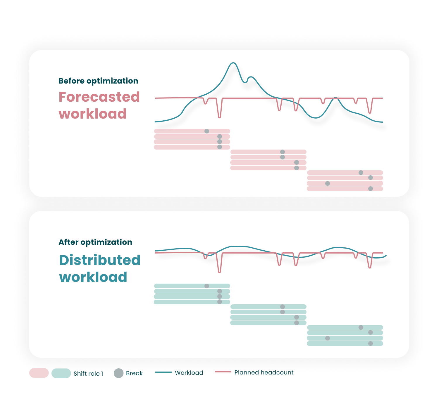 We’ve found that companies find it difficult to efficiently plan their labor around their production plan because of equipment and labor constraints. Demand is often volatile and requires continuous rescheduling. Understaffing and overstaffing is therefore common and leads to unproductivity and high costs spent on agency staff and/or overtime. Labor Production Planning translates future and incoming orders into a required headcount suitable to the way shifts are rotated throughout the day by flattening and minimizing demand peaks. This allows you to efficiently distribute and plan your workforce and equipment. The required headcount is used as an input to create optimal shifts based on allowed shift types that are compliant with labor laws, which in turn are assigned to available staff members based on contract hours, skills, certificates etc.