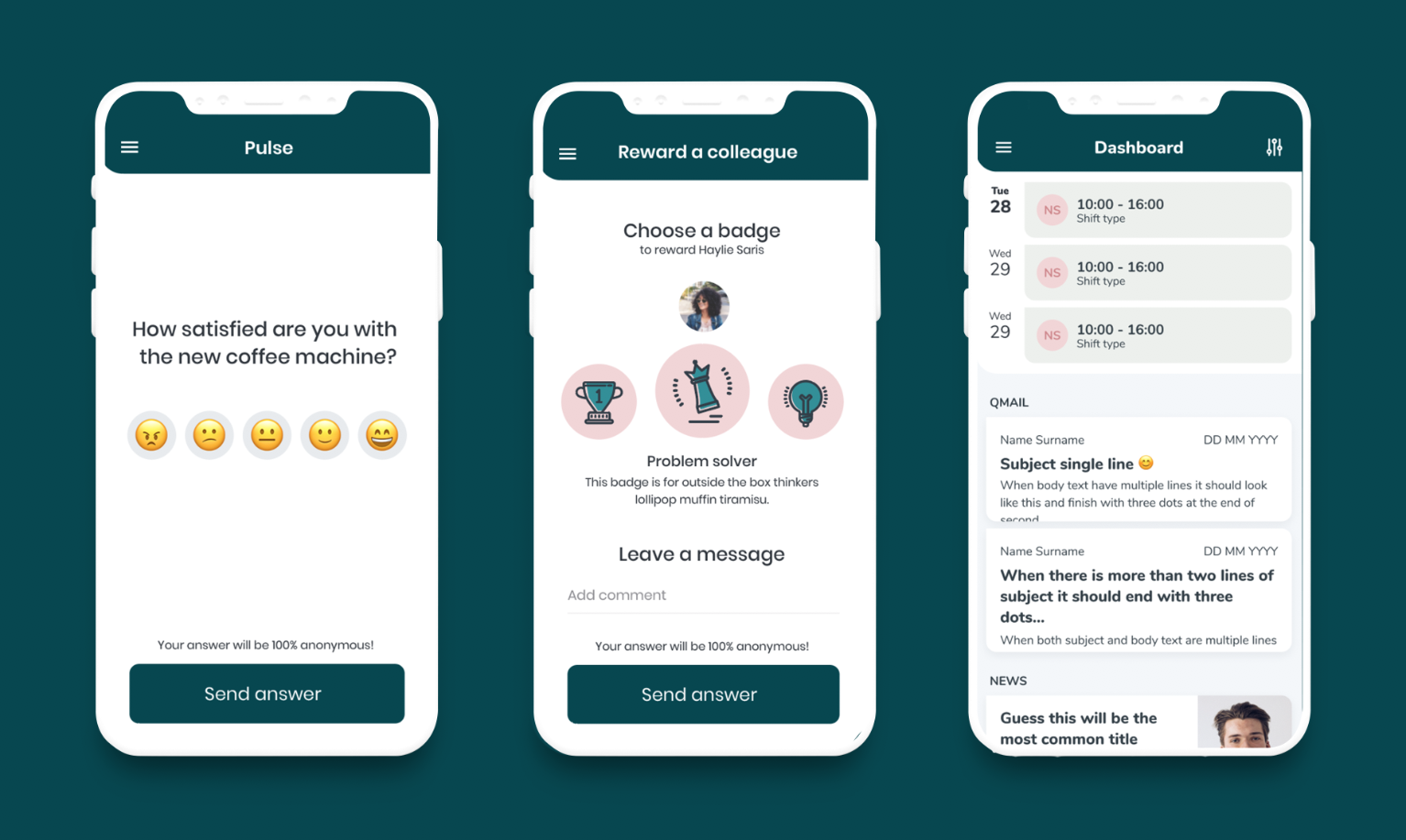 Boosta trivsel och motivation med vår Quinyx Engage som är utvecklad för mobilen. Med Engage är det enkelt att göra enkäter, ge poäng och medaljer samt att få feedback från medarbetarna om hur de har det. Du kan också öppna möjligheten för medarbetarna att önska skift och svara på semesteransökningar.